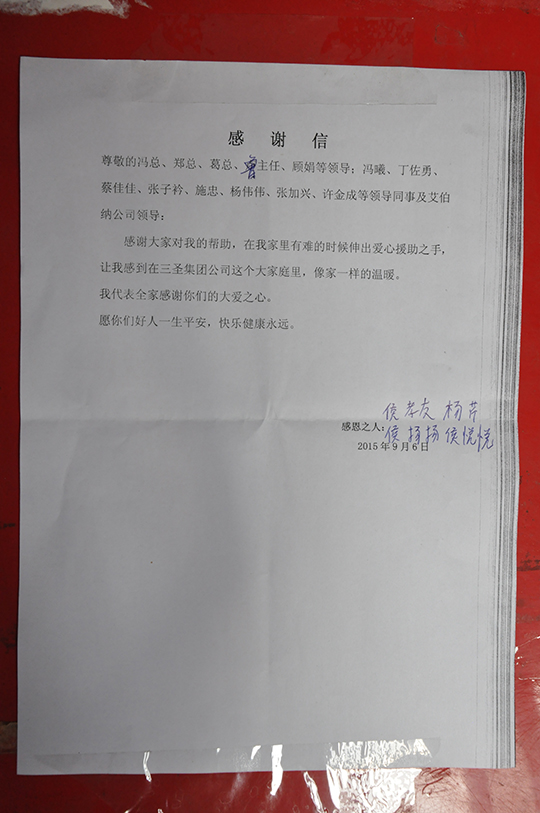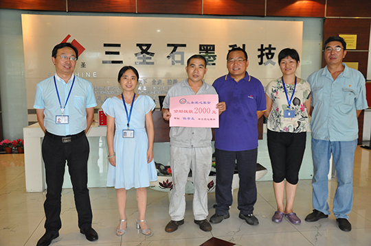 四、 董事長(zhǎng)親自捐贈(zèng)善款救助聽(tīng)到侯孝友的實(shí)際困難匯報(bào)后,董事長(zhǎng)非常關(guān)心,立即拿出私人款2000元現(xiàn)金資助,幫助侯孝友度過(guò)暫時(shí)的難關(guān)。鄭董還親自接待了侯孝友,詳細(xì)了解了他家庭目前的狀況,鼓勵(lì)他樹(shù)立信心,克服暫時(shí)困難,及時(shí)幫助妻子治療,引導(dǎo)兒女安心學(xué)習(xí),同時(shí),希望他在公司本職工作中繼續(xù)發(fā)揚(yáng)不拍苦、腳踏實(shí)地的精神,積極專研技能,不要辜負(fù)三圣愛(ài)心傳遞的希望。