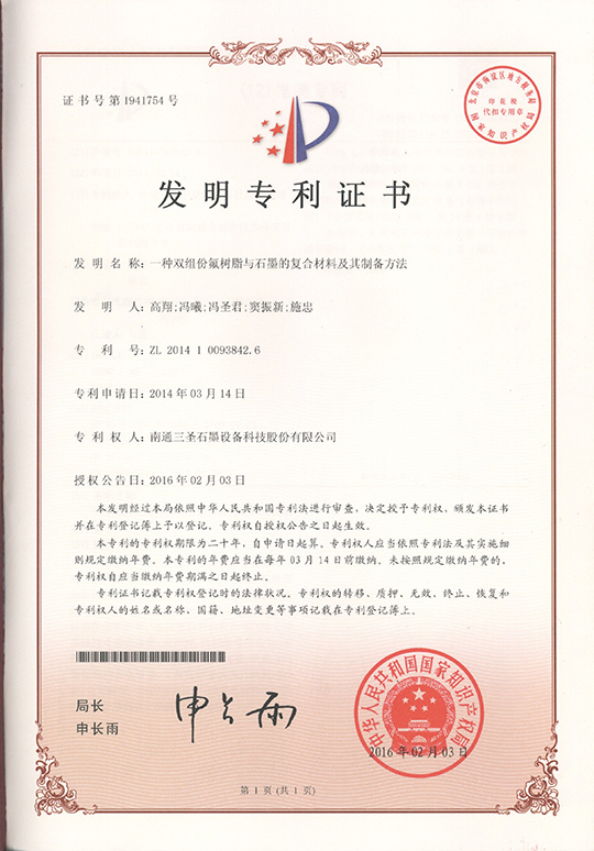 2016年2月18日,南通三圣石墨設(shè)備科技股份有限公司收到國家知識產(chǎn)權(quán)局的發(fā)明專利證書,該公司的發(fā)明專利"一種雙組份氟樹脂與石墨的復(fù)合材料及其制備方法"獲得了國家授權(quán)。該項專利涉及一種完全意義上的新型氟-石墨復(fù)合材料,該復(fù)合材料既具有石墨優(yōu)良的導(dǎo)熱性能,又具有優(yōu)異的耐腐蝕性能,由該種材料制成的換熱設(shè)備可用于強腐蝕工況條件下的換熱,打破了此前常規(guī)設(shè)備滲透壓力耐受瓶頸,實現(xiàn)了鋼鐵酸洗工序上酸液換熱設(shè)備的國產(chǎn)化。