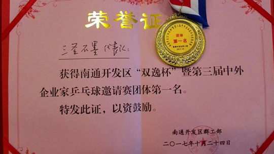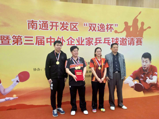 10月24日,三圣石墨代表隊參加南通開發(fā)區(qū)“雙逸杯”暨第三屆中外企業(yè)家乒乓球邀請賽,通過一天的緊張角逐,過關(guān)斬將,最終在24支代表隊中脫穎而出,獲得本次比賽冠軍。