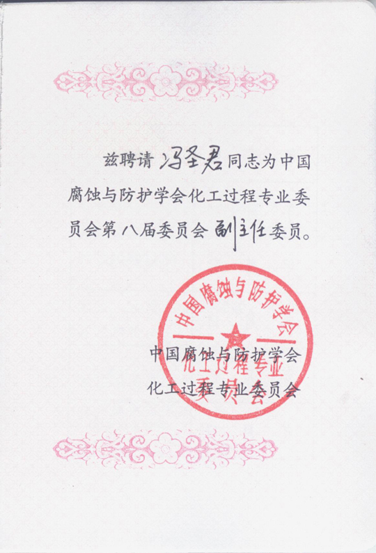 日前,公司馮圣君董事長收到證書,正式出任中國腐蝕與防護(hù)學(xué)會化工過程專業(yè)委員會第八屆委員會副主任委員。